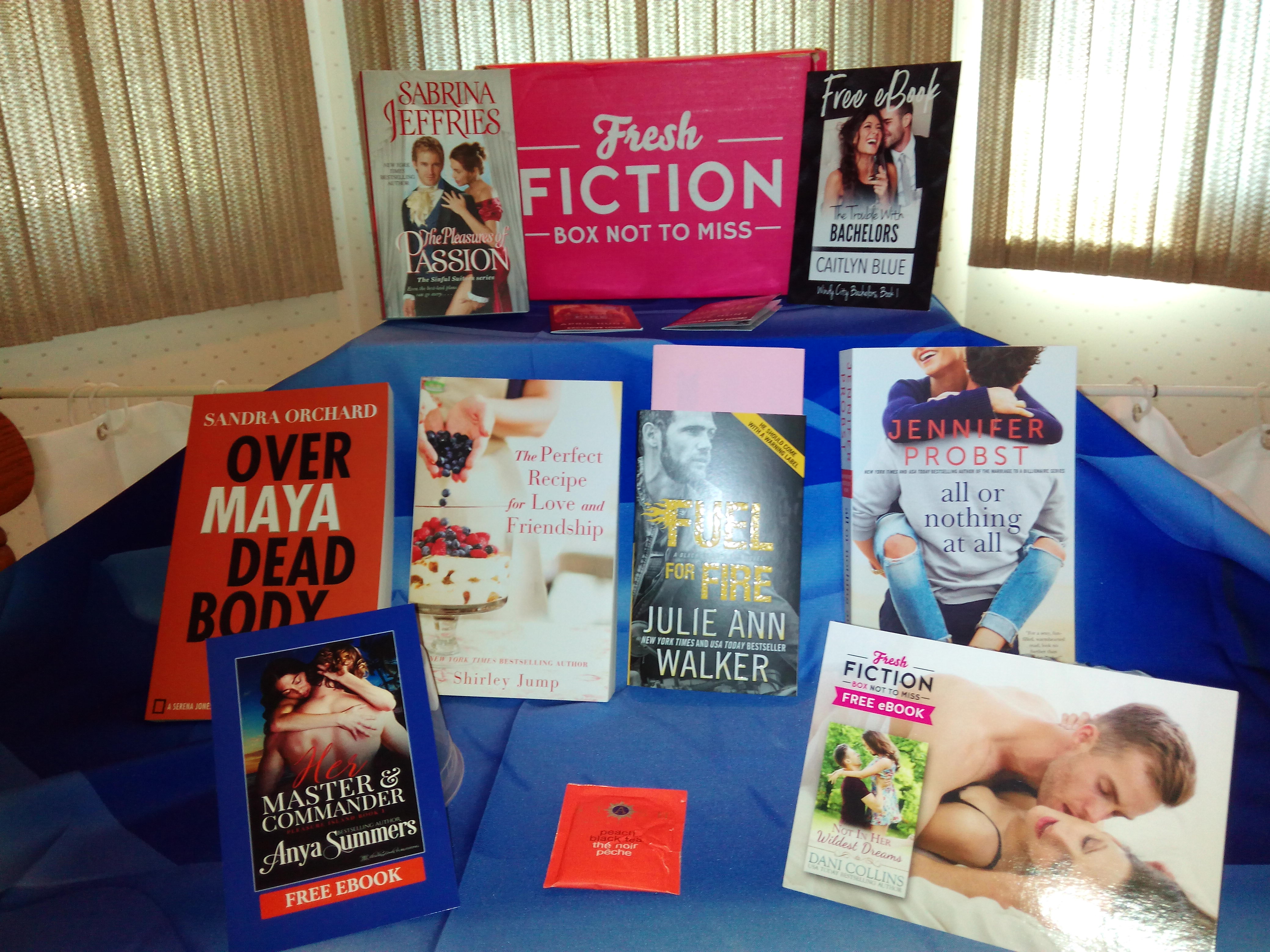 Fresh Fiction is an entertainment and book review site, one where I post reviews as well as here at Roses Are Blue. They offer a monthly book subscription service, which will include a minimum of 2-3 ebook download cards and 3-5 hard copy books. (There’s generally a small treat enclosed, usually in the form of a tea sample!)